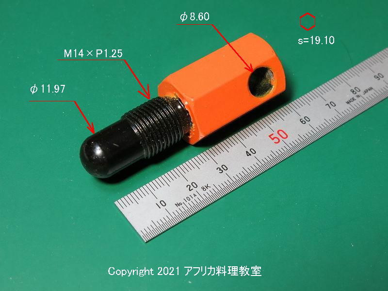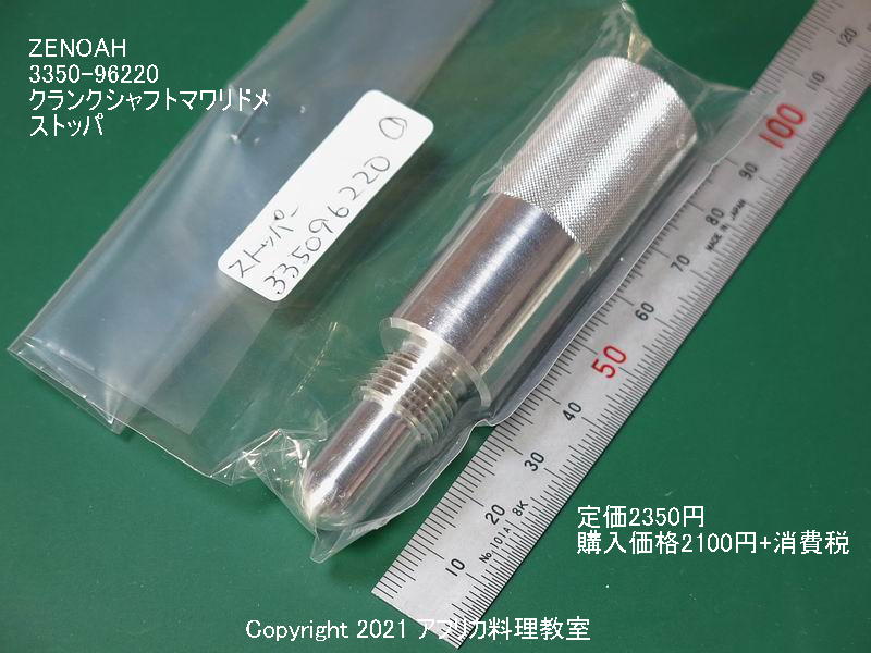 これは ZENOAH 全能 ゼノアの クランクシャフト回り止めストッパ 3350-96220 俗に言うピストンストッパーアルミ製 定価は2350円だけど、近所の機械工具屋では少し安くしてくれて 2100円+消費税10% M14P1.25ねじ部からの出代は約18mm(φ10.93) つまみ部外径φ19.82 ebayやaliで同様のものが安価に出品されているよ。 | |