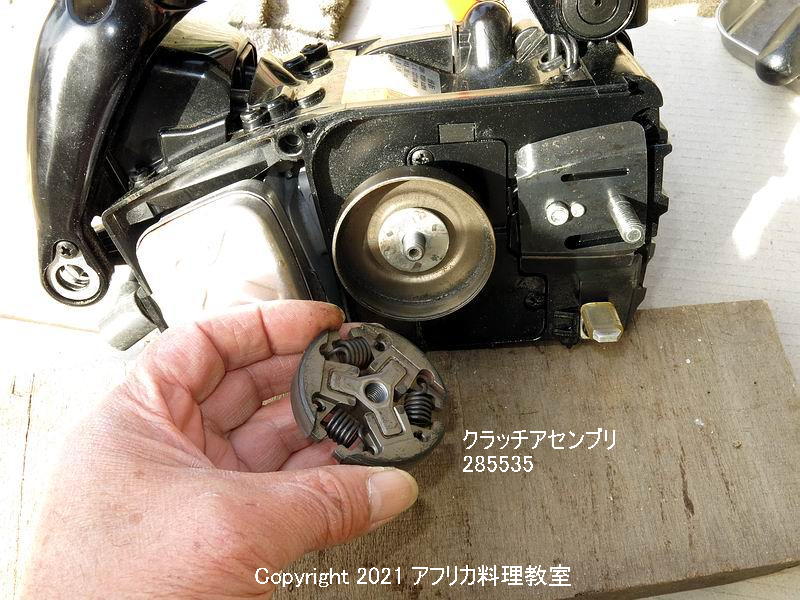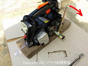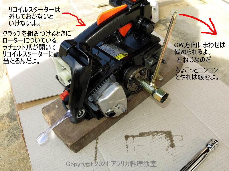 <注意>クラッチを外す前に、リコイルスターターは外しておく。 クラッチの六角部(s=13)にソケットレンチか、コンビボックスレンチ13×19を差込み、コンとCW方向にすとクラッチが緩む。 | |