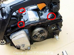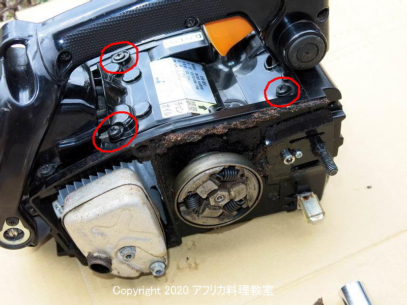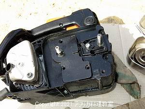 あらかじめ、作業しやすくべく、チェーンケース、ガイドバー、チェーンを外しておく。 プライマリーポンプにアクセスするために、トップカバーを外す。バインドタッピンねじ4×16 3箇所 | |
