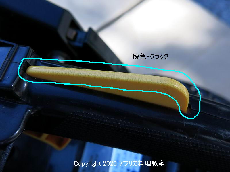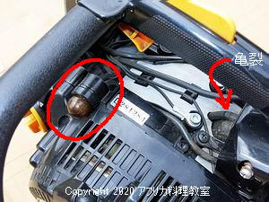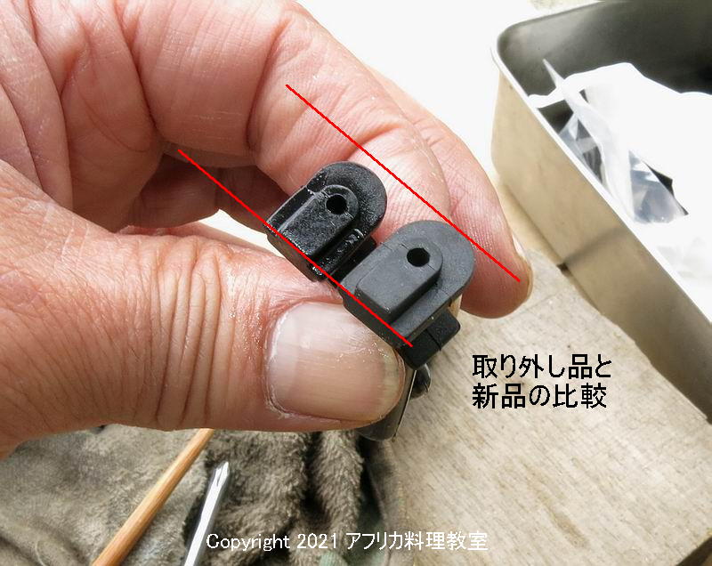 これは、セーフティーレバー 耐光性が悪い樹脂を使っているので、色が薄くなって黄色に変わり、やがてはクラックが入る。 スロットルレバーも脱色。 エアクリナーカバーのノブも同様。 チョークレバーだけは、脱色を免れている。 | |