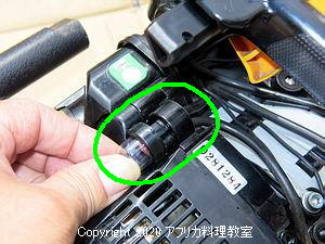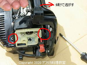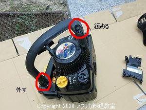 サイドハンドルを固定しているバインドタッピンねじ5×14 2本を外し、スプリングボス側のなべタッピンねじ5×20を緩めておくと、 トップハンドルが右側に逃げて、キャブレターカバーのねじを緩めることができる。 | |
