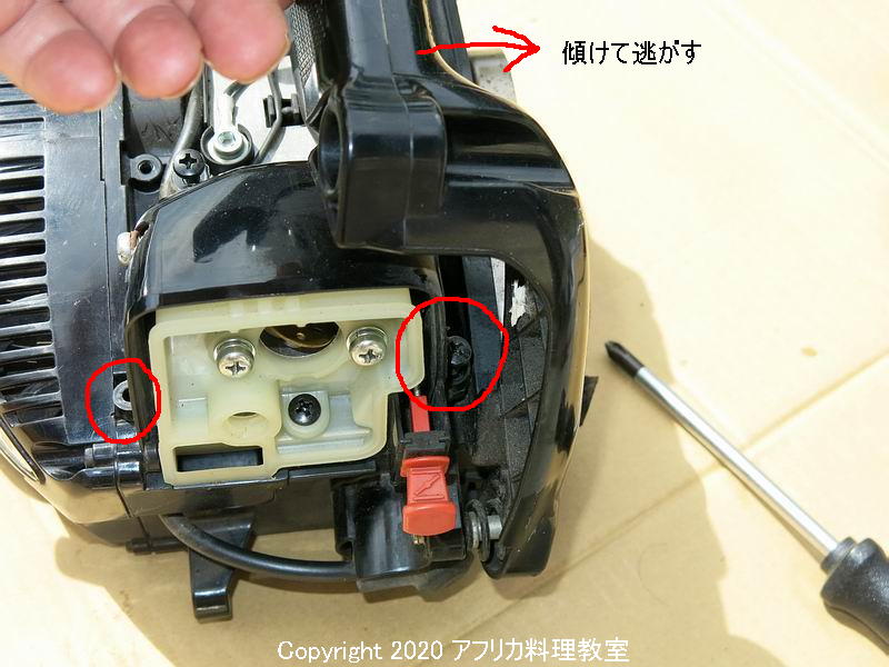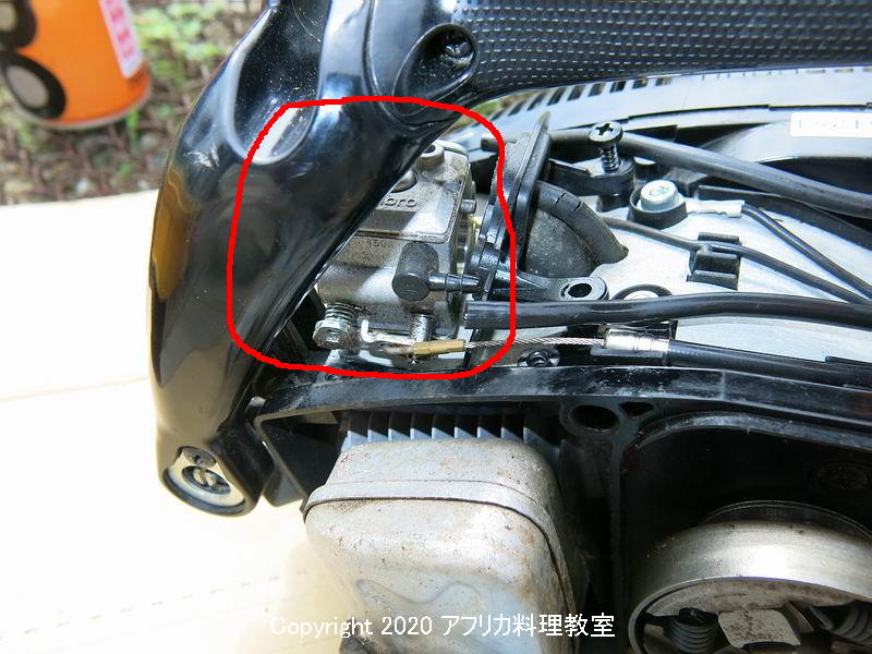 キャブレターカバーを外す。左側のバインドタッピンねじ4×16は容易に外れるが、右側はトップハンドルが邪魔になり、ドライバーが入らない。 | |