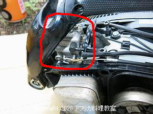 エアクリナーボディを固定しているなべ小ねじM5×45 2本、バインドタッピンねじ4×16 1本を外し、エアクリナーボディを外す。 チョークロッド・リンケージ、アクセルワイヤー・リンケージを外し、燃料供給ホース、燃料吐き出しホース(背面)を抜いて、キャブを外す。 | |
