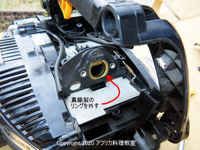 キャブを外すと、ようやくインレットパイプ(インシュレータ)が現れる。でもまだこれからが大変。 真鍮製のリングをコロッと取り外し | |