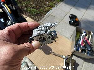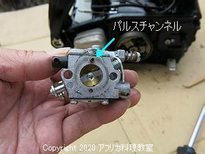 取り外したキャブ。エンジン側のここにあるのがパルスチャンネル。 このキャブは日本製のようです。 | |