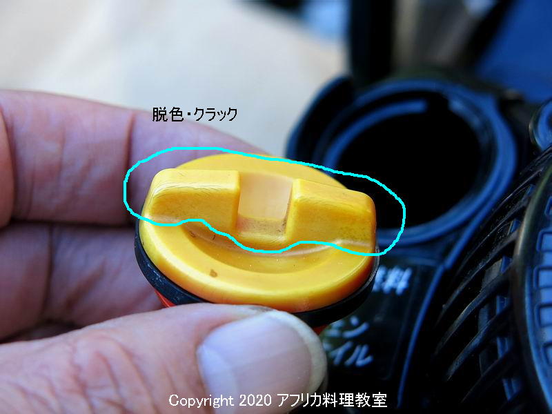 これは、燃料キャップ。 本来は橙色 色が薄くなり、クラックが入る。 丸山では、金型設計、樹脂成形は上手だが、よいペレットが入手できないようです。 |