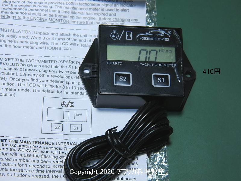 最近はエンジン回転計が安く手に入る。 KEBIDUMEI KBT001310 410円 by AliExpress 台湾から15日 アワーメーター表示だけど、リード線をイグニッションコードに近づけるとパルスを拾い、rpm表示に切り替わる。 分解能10rpm 25000rpmまで測れるようです。 初期設定は2サイクルエンジンに設定されているので、そのままで使える。S1ボタン4秒以上押していると、01、02、03、04、05と切り替わる。手を離して8秒から10秒放置すると、アワーメーターに戻る。 01:4サイクルエンジン単気筒 02:2サイクルエンジン単気筒 03:その他のエンジン 04:アワーメータ表示のみ 05:05表示の後、一旦手を離し、05rpm点滅のあとアワーメータ表示に戻った後、S1×S2をずっと押していると、アワーメータ他、初期状態にリセットされる。 | |