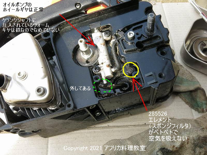 ようやくオイルポンプが出てきた。 見た感じでは、ポンプ自体は悪くなさそう。ウォームギヤも、ポンプホイールギヤも舐めてはいない。 チェーンオイルタンク内に空気を吸うためのブリーザの手前にある、スポンジがべとべとになって、悪さしていたように思う。 それか、Oリングが熱で変形して、そこから空気を吸っていたと思われる。 スポンジとOリングを交換すれば直るかな。 | |