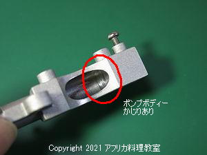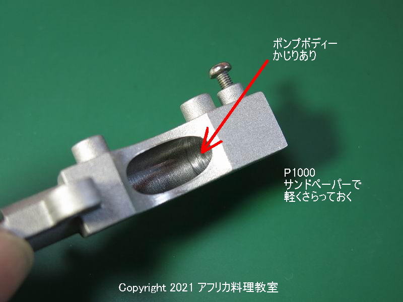 ポンプボディーの内面を確認したところ、若干のかじり磨耗があった。 P1000 サンドペーパーを両面テープでφ9の棒材に巻きつけ、軽くさらう。 | |