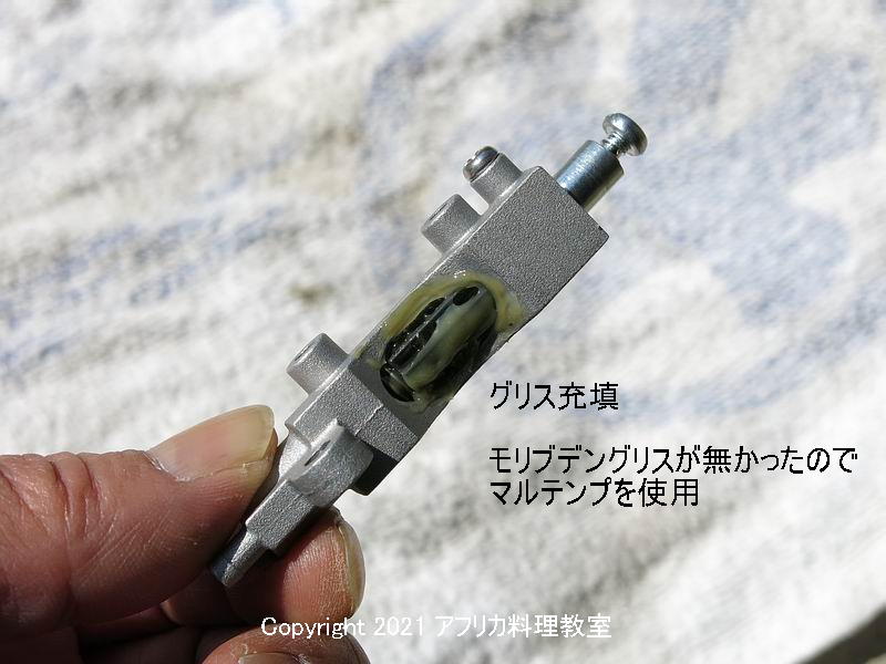 ギヤや、ポンプ摺動部分にグリスアップして組み付け、本体に戻す。 | |