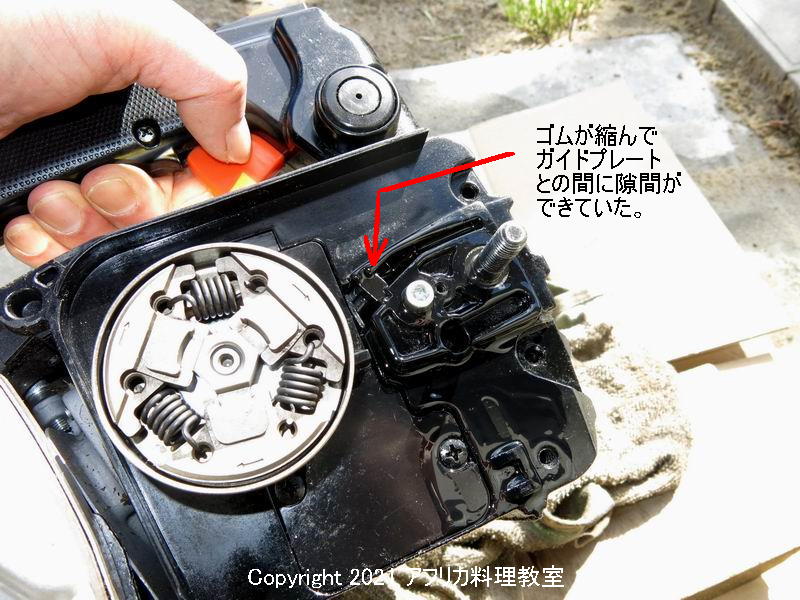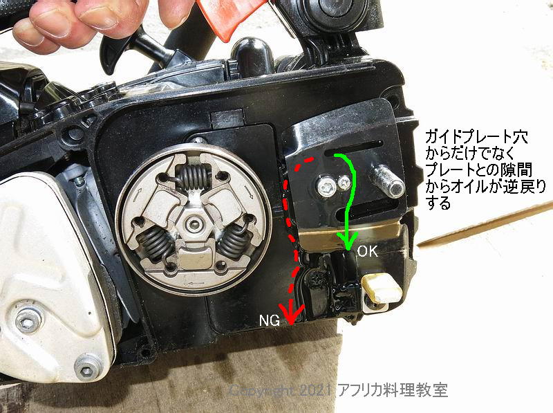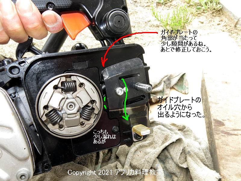 ポンプカバー、クラッチ、リコイルスターターを元に戻し、エンジン始動。 ガイドプレートの穴からドバドバ出るようになった。 鉄板との隙間から若干オイル漏れがある、鉄板の角がケースに当たって少し浮いて隙間が出来ていることによるものと思われる。あとで手直ししておこう。 | |