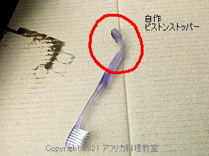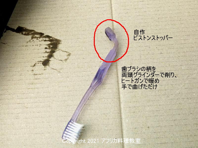 クラッチを外すためには、ピストンの動きを止める必要がある。 世の中には専用のピストンストッパーがあるが、手に入らない場合には自作しよう。 これは歯ブラシの柄を削って、曲げただけの自作ピストンストッパー。 ハスクバーナのストッパーをまねて作った。 | |