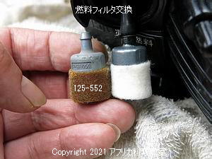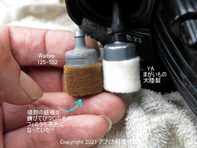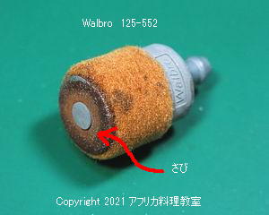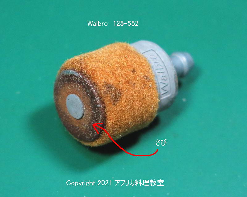 純正はWALBRO 125-552(左)。 パーツリストではステンレスメッシュ2次エレメントつきの125-527が掲載されてたが、実機では125-552が使われていた。 それのまがい物(互換品)に交換 YA(福井の人)で2個390円+送料120円 | |