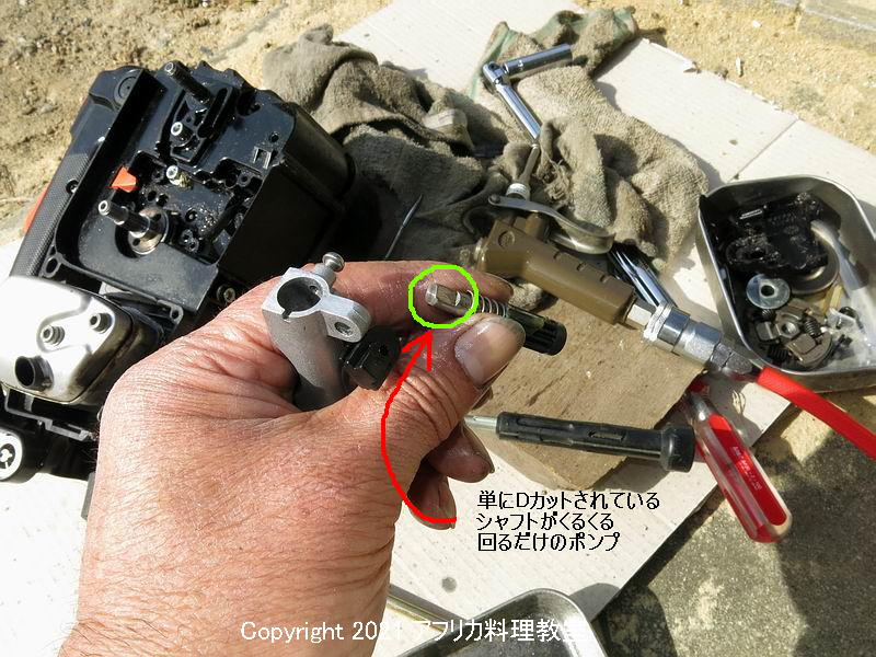ポンプを分解。ポンプといっても簡単な構造。 シャフトの先がDカットされただけのもの。 | |