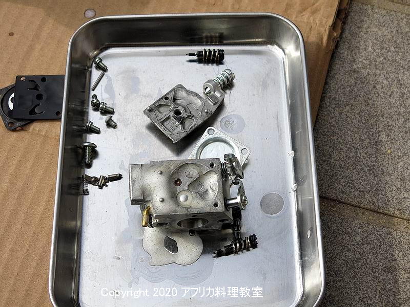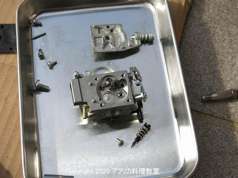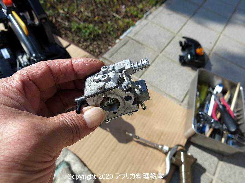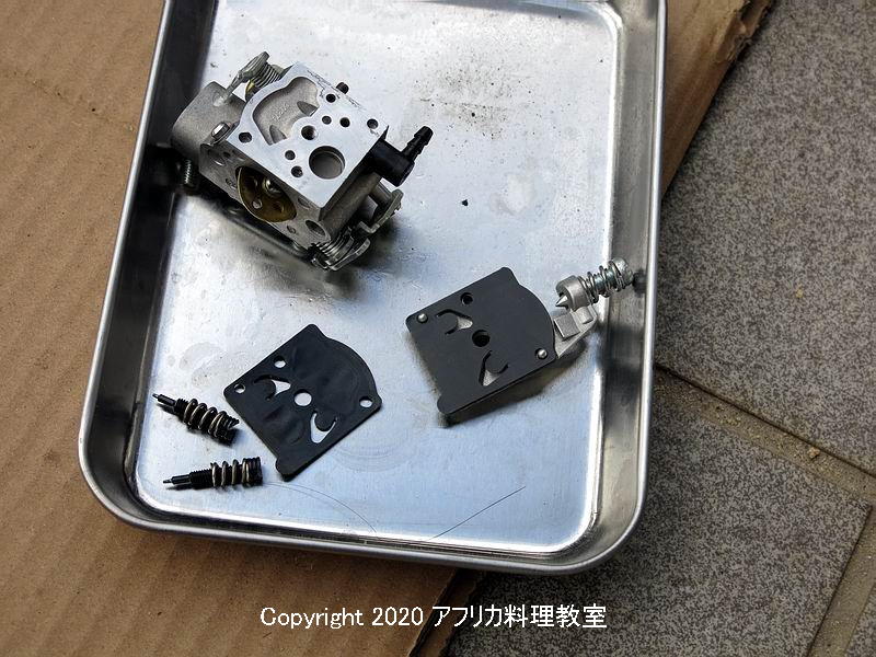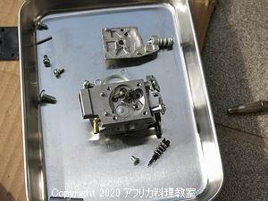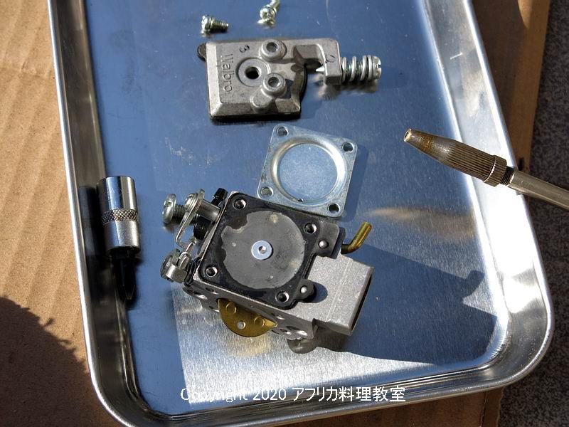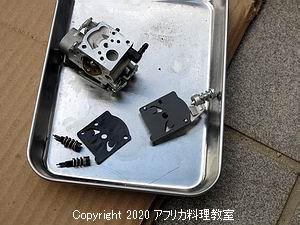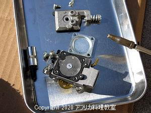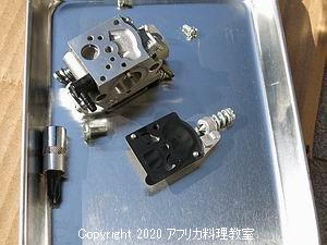 高速回転のあと、アイドリングに戻ったときにエンストするので、ポンプダイヤフラム、メターリングダイヤフラムの劣化やスラッジの溜りがないか確かめるべく、キャブを分解清掃した。 |