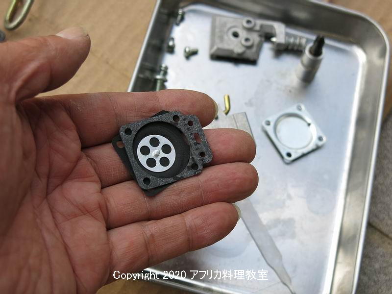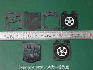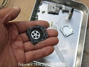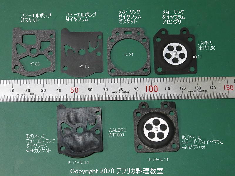 新品のメターリングダイヤフラムとガスケットをおごる。 アルミのボッチの出代が同じかどうか確認しておくとよい。 1.58前後だった。 ガスケットの厚みも確認しておくとよい。外したやつは0.81ぐらいかな。 | |