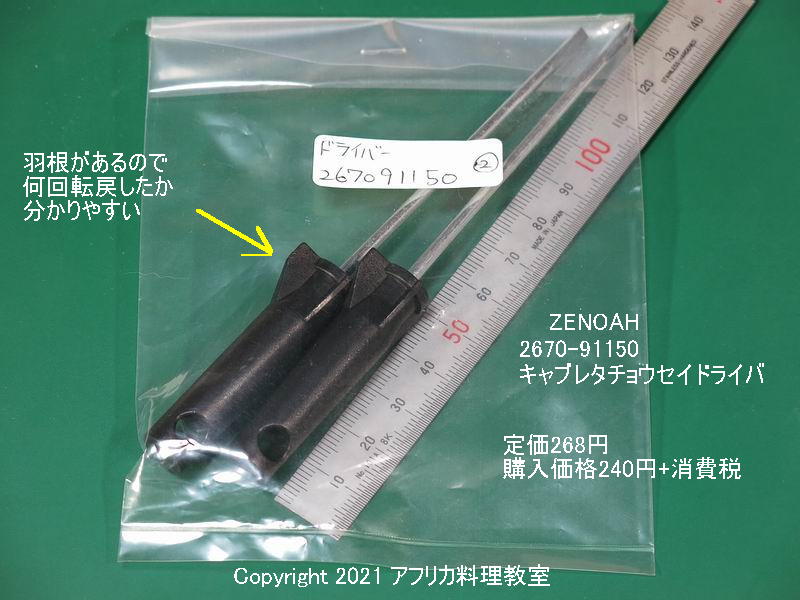 これはゼノアのキャブレタ調整ドライバー 低速ニードル、高速ニードルの調整には、羽根の付いたドライバーを用いると、何回転戻したのか分かりやすいので便利。 だけど、マイナスの厚みが薄いので、調整ねじに差し込むとガバガバ。すわりが悪い。使いにくいので買わないほうが良い。 | |