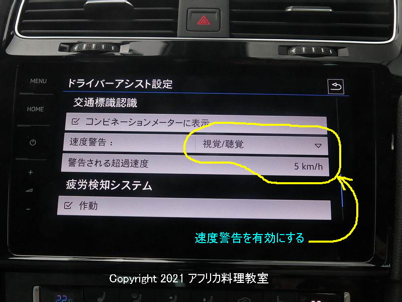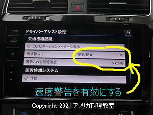 ドライバーアシスト設定 交通標識認識 速度警告をOFFにして使っていたが、これを有効にする。 | |