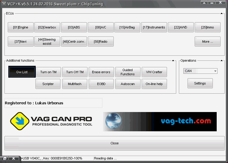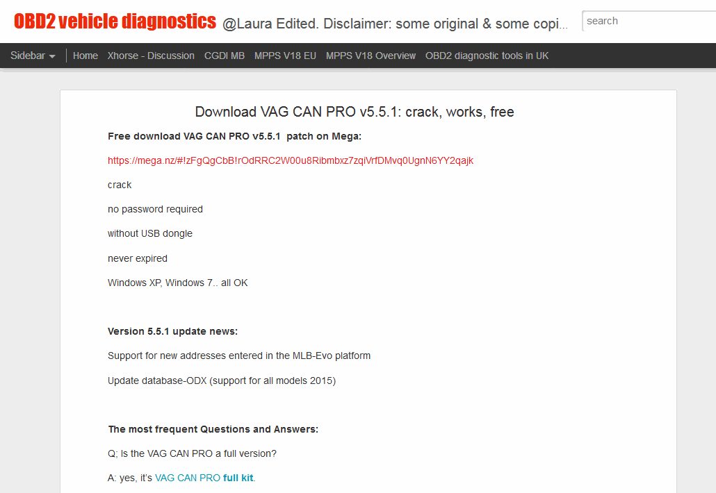 2021.9.15 USBドングルなしの安いほうのケーブル(1390円ぐらい)を買った人は、sp275patchファイルをwebで探す。または販売者からファイルのありかを教えてもらう。 紹介ページリンク http://obd2-diag.blogspot.com/2017/04/download-vag-can-pro-v551-crack-100.html ファイルのありか https://mega.nz/#!zFgQgCbB!rOdRRC2W00u8Ribmbxz7zqiVrfDMvq0UgnN6YY2qajk sp275patch.zipファイルをダウンロード、 それを展開し、2つのファイル RSA.dll SCard.dll をコピーし、VCPソフト内のdllと置き換えると動作するんだよ。 今回はトラブルを避けるべくUSBドングルつきのほうを買ったが、USBドングルなし1390円でもVCPが立ち上がりVIMが出来たとは。 世の中そういうもんだ。 VCP5-5-1 software link: https://mega.nz/#F!wowlQSCA!AoipHNvsH0qxakW04i0_Nw VCP551をwinXPマシンで使っているが、win7(x86)、win10(x64)でも普通に使えた。sp275Patchも。 |