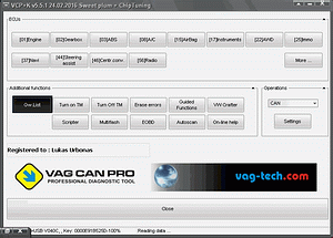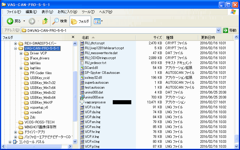 ソフトを動かすのに必要なのは、FTDIのドライバーインストールのみ。 過去にFTDIの(FT232RLとか)USB-シリアル変換ケーブルのドライバーを インストールしていたのなら、インストール不要。 (VCP551のチップはFT245RLなので、正確に言うとUSB-パラレル変換なんです。) VAG-CAN-PRO 5.5.1は実行ファイルvagcanpro.exeを直接クリックすれば立ち上がる。 VCP551を立ち上げる前に、USB鍵ドングル、VCPケーブルそれぞれをPCが認識している 必要がある。 | ||