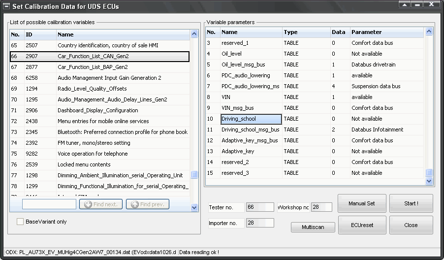 Zdcファイルを選んだあと、SPEED 255が表示されるが、 左下の真ん中、Upload selected dataのソフトキーがアクティブにならなかった。 (たぶんだけど、このとき単に通信が失敗、一旦キャンセルしてもう一度リトライすれば、 Upload selected dataがアクティブになっていたと思われる) Gw.Listでフォルトをチェックしても、普通に通信できているので、 VCPケーブルはGOLF7.5と通信はできているはずなのになぜかな? CDに収録されているZDCファイルが古い(2016年)ので跳ねられのだろうと、半ばあきらめた。 その後、GOLF_VII_DISC_PRO_VIM_DEF.zdc GOLF_VII_DISC_PRO_VIM_DAB.zdc も試したけど、やはりErrorが出ていた。 finishの工程では成功と出ていたと思うが、その前の工程でErrorが出てたので NGだと思い込んでいた。 しかし、その後ダメ元で車種を AU37X Audi A3~VW48X VW Passat B8まで、 順番に選んで Select and closeを試みる。 それでもやっぱり Error opening communication with ECU!のままで ECU flashing finished sucessfully!とは成らなかった。 (いろんな車種を試したからだろうか)5Fでフォルトがたくさん出ていたので、VCPでフォルトを消去して、 翌朝、いつものように家を出発したら、テレビ画面出てた。 http://automiltech.blog.shinobi.jp/Entry/781/ automiltechのブログ そこに紹介されている https://www.youtube.com/watch?v=g7vaUkFZXV0 VAG-TECHの動画、v3.5.1 20.08.2013 Smartcardでの手順 https://www.youtube.com/watch?v=aCpQQ4edMgc v6.0.1 25.04.2016 New hope を見ると Upload selected dataのあと、Error...となっているが、それで終了しているので、 当時のバージョンではSTATUSがErrorで終わっても書き換えはできているのだろうと思われる。 動画の説明にはこうあった Error at the end can be ignored. New build of VCP uses PRNR-REF readed from ECU, so this error should not appear anymore. 終わりのエラーは無視できる。... もはやこのエラーは出すべきものではない。だとさ。 終了時にエラーは出ているが、書き換えは終わっている。 Error表示がでるのはVCPソフトの表示の問題だけだったようです。 導入前にこの動画のコメントを見ておけばよかった。 https://www.youtube.com/watch?v=9AMgbzXOlQ0 VIM閾値設定 5.5.1にこのプロシージャはありません。 業者に頼むと1万円ぐらい、 Amazonでフォルクスワーゲンテレビロックキャンセラー VW KUFATEC 39960 【DISCOVER PRO 搭載車専用】 を買うと13000円もするが、これは安価にテレビが視られます。 |