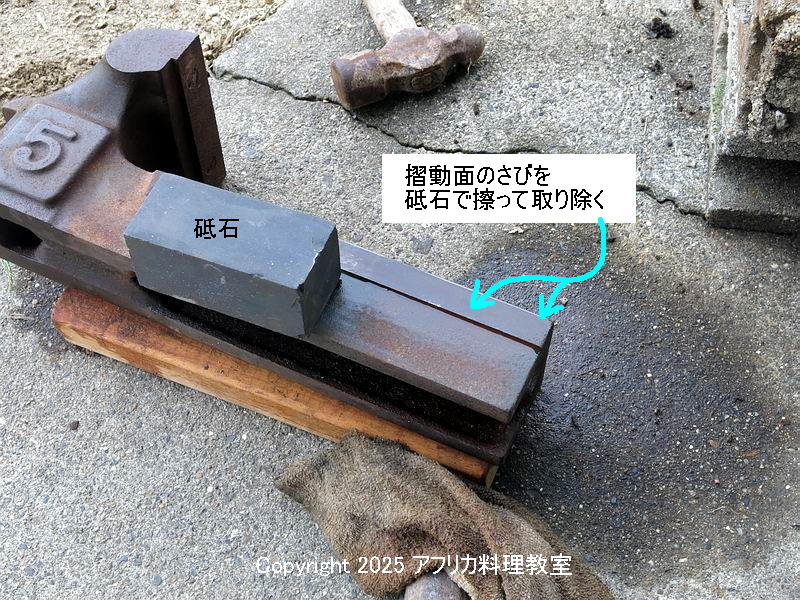 各摺動部の錆びをスクレーパーと砥石で取り除く。